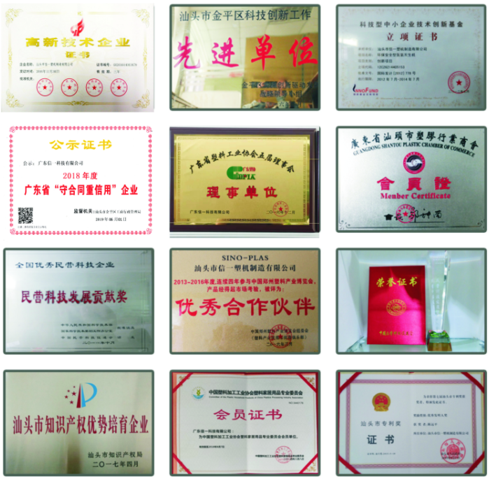 多年来,信一科技凭借在专业领域的突出成就,获得了众多的荣誉和奖项:2002年,注册“信一商标”,产品荣获了“中国名优产品”称号;通过ISO9001:2015国际质量管理体系认证;连续五年获得“广东省守合同、重信用企业”;产品拥有国家发明、实用型专利(项目)18个;凭借稳定的性能、严谨的工艺技术及务实守信的服务宗旨,信一科技已逐步转型为协助客户实现现代塑胶工厂自动化生产模式而进行生产和规划的专业公司:为客户设计提供以原料输送系统为纽带,其他辅机协助,一个平台操控,多功能同时运作的高效自动化生产线,赢得了国内外客户的高度认可和信赖。