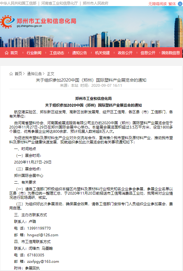 日,郑州市工业和信息化局在官方网站发文:关于组织参加2020中国(郑州)国际塑料产业展览会的通知。